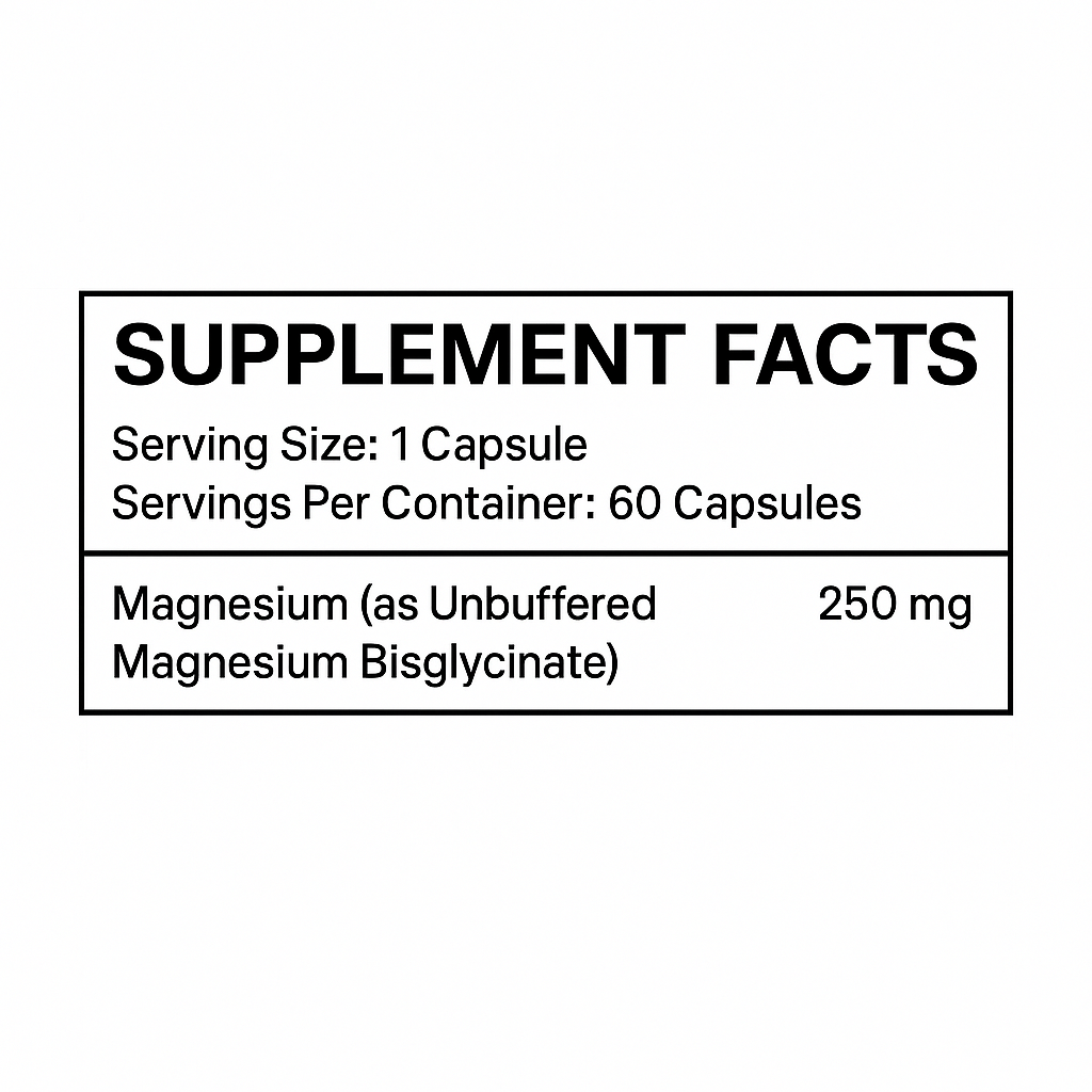 Unbuffered Magnesium Bisglycinate (250 mg): The gold standard of magnesium. "Unbuffered" means this is 100% pure Magnesium Bisglycinate Chelate. It has not been diluted or mixed with cheap Magnesium Oxide.
