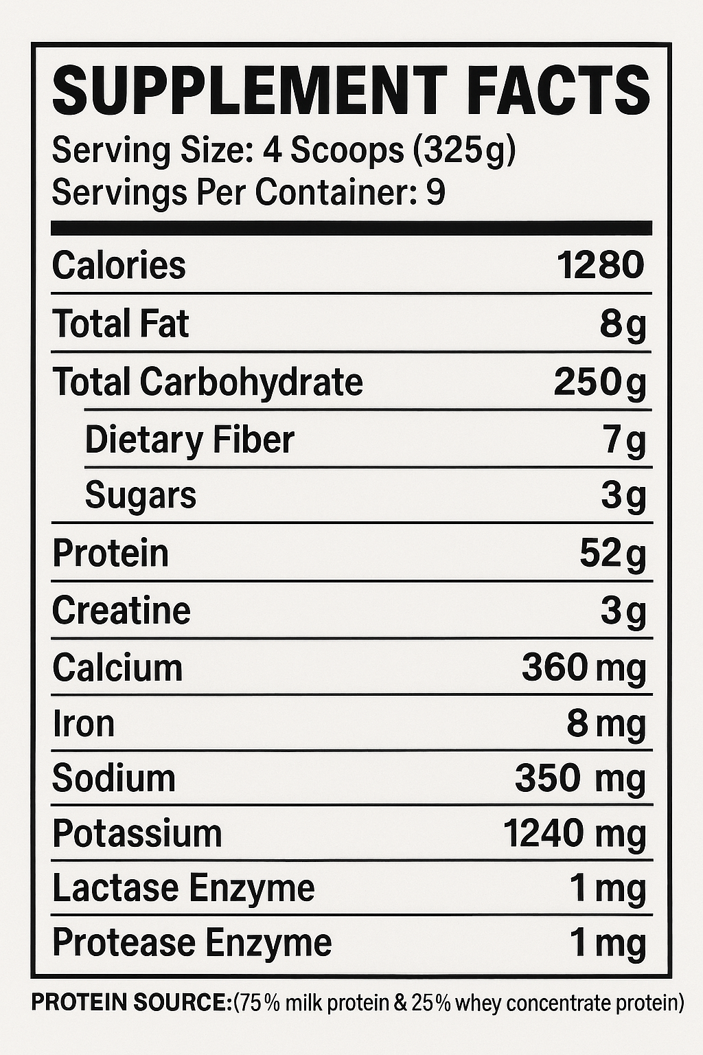 Lactase (1 mg) & Protease (1 mg): A gainer is useless if you can't digest it. We have fortified this formula with enzymes to break down the massive calorie load and creatine, ensuring high absorption and eliminating the "heavy stomach" feeling.