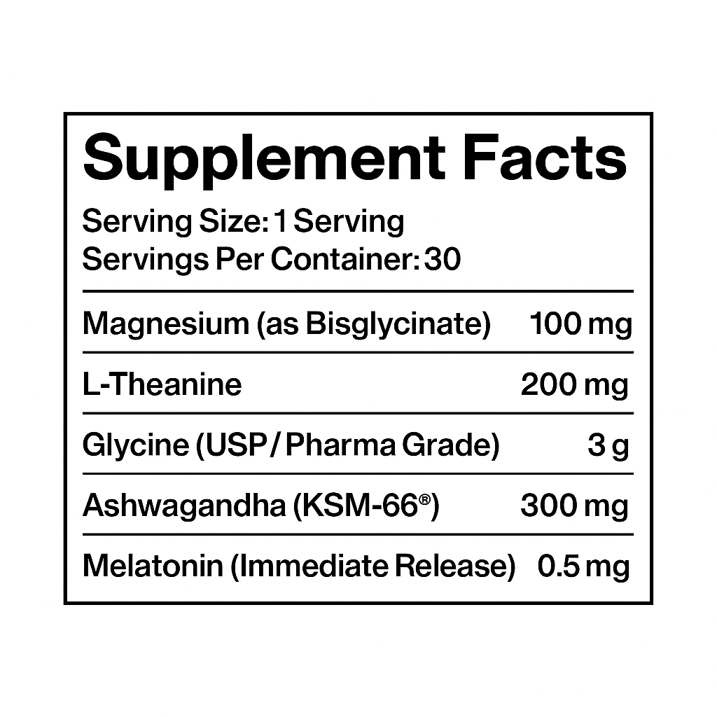 Glycine (Pharma Grade) – 3,000 mg: The hero of this formula. A massive clinical dose of the amino acid Glycine. Unlike sedatives, Glycine works by lowering your core body temperature, which is the biological signal your brain needs to transition into deep, slow-wave sleep.